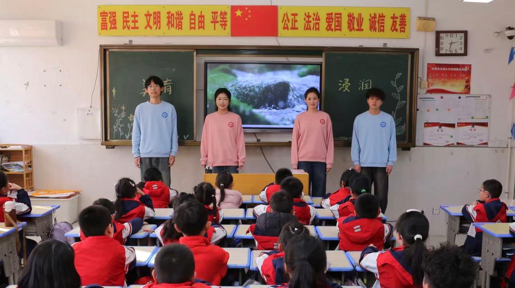 12月10日,信阳师范大学传媒学院师生走进羊山外国语小学,开展“美育浸润”主题实践活动。本次活动立足美育本质,以语言艺术为审美媒介,通过朗诵、诗词鉴赏、经典配音与推普互动等多元形式,引导小学生在声音与文字的韵律中感知美、理解美、表达美,切实提升其审美素养、文化认同与人文情怀,推动高校优质美育资源向基础教育纵深延伸。