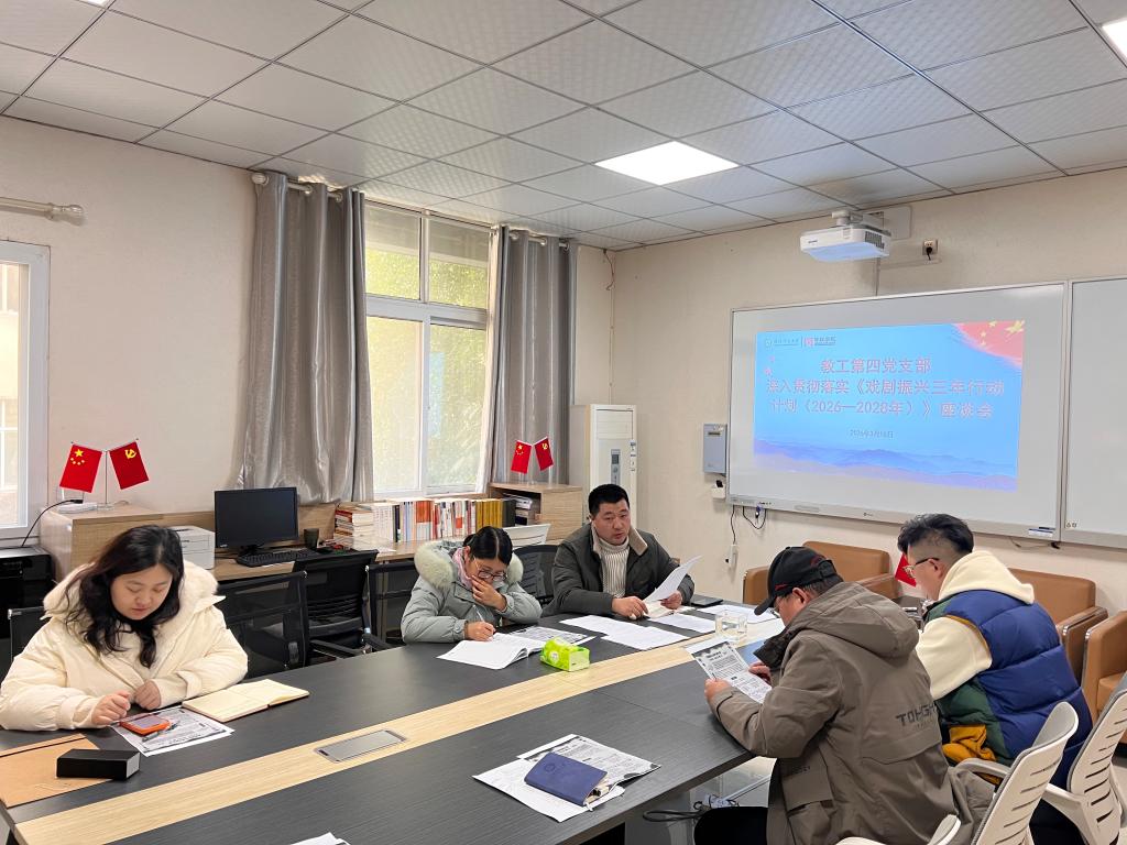 3月12日,传媒学院教工第四党支部集中学习中共中央宣传部等五部门联合印发的《戏剧振兴三年行动计划(2026—2028年)》。会议由党支部书记段金龙主持,支部全体党员参加。