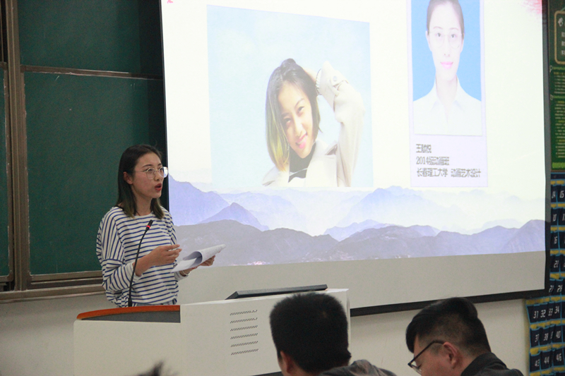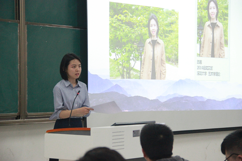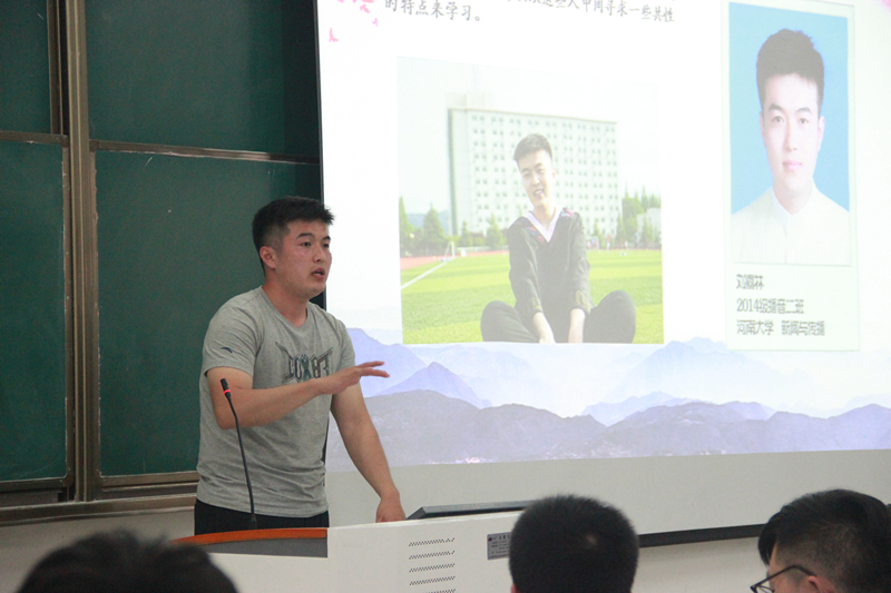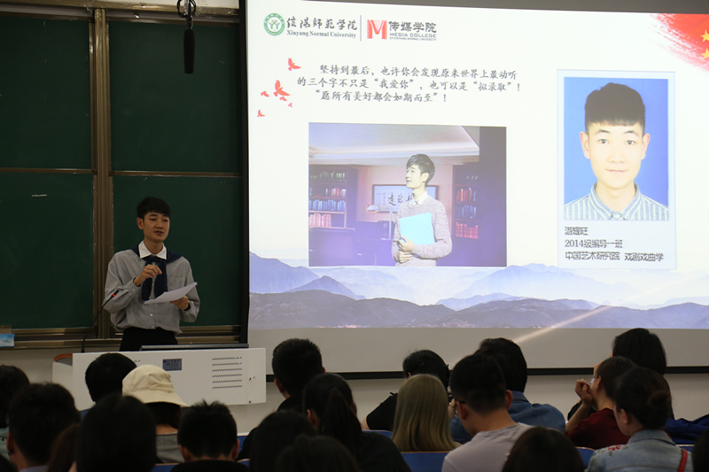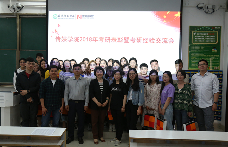 刘新建宣读2018年考研录取学生名单后,录取学生上台领取奖品并与领导老师合影留念。随后,四位学生代表2014级播音专业刘嘉林、编导专业游耀旺、戏文专业陈蓉、动画专业王献悦依次上台分享考研经验。刘嘉林强调考研学校和专业的选择,适合自己的才是最好的,要从自身能力、未来发展前景等方面综合考虑,同时要合理分配实践活动和学习的时间安排;游耀旺认为关注时政热点很有必要,强调自学能力,专业知识和英语学习都应将“重复”做到极致;陈蓉建议专业课学习要注重理论与实例相结合,要把英语学习放在重要位置,还要密切关注导师科研动态;王献悦以因自身备考松懈错失中国传媒大学为例,告诫大家要严格按照计划执行,在一点一滴中积累,如若最后需要调剂,提前做好准备。